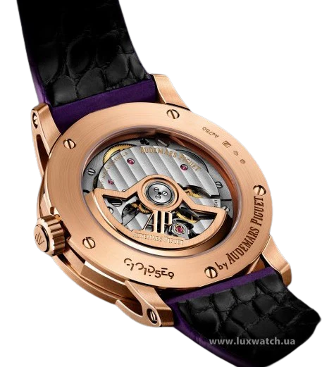 77410OR.OO.A623CR.01 Audemars Piguet This watch comes in a 38 mm 18K Rose Gold case. Fixed 18K Rose Gold bezel. Prune coloured inner bezel with minute scale. The prune coloured guillochĂ© dial. Rose gold-tone skeleton hour hands with luminous coating. Rose gold-tone hour markers. Central second hand. The date window is located at the 3 o'clock position. The watch performs following functions: hours, minutes, seconds, date. Self-winding mechanical movement is powered by a Сalibre 5900. Power reserve approximately 60 hours. Case Thickness - 9.6 mm. Case back is transparent. Sapphire crystal protects front and back side of the watch. Prune coloured alligator leather strap with pin clasp. This model is water-resistant up to 30 m.Â
