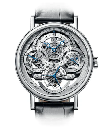 3795PT/1E/9WU Breguet The Breguet Classique Complications 3795PT/1E/9WU is the luxury Men's watch, featuring a sleek 41 mm Platinum case and an outstanding 18-carat gold skeleton dial that showcases intricate details in silvered 18-carat gold. The individually numbered and signed BREGUET watch features Roman numerals on a sapphire disc and open-tipped Breguet hands in blued steel. This watch is a true masterpiece with retrograde dates indication at 12 o'clock, days at 9 o'clock, and months and leap years at 3 o'clock on a stunning display. The small seconds on the tourbillon axis adds another level of sophistication. The manually wound movement in combination with the tourbillon and perpetual calendar provides unsurpassed accuracy and reliability, with a power reserve of 50 hours, making this watch an excellent choice for any watch enthusiast. The leather strap with a triple-blade folding clasp sits comfortably on the wrist, accenting the watch's grandeur. With water resistance up to 30 m / 100 ft, this distinctive timepiece is also durable.