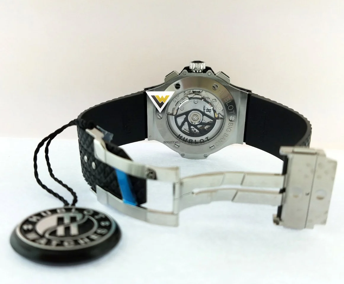 301.SB.131.RX Hublot. The Hublot Big Bang Chronograph Automatic 301.SB.131.RX is a sleek and stylish luxury watch that combines functionality and design. The watch features a fixed ceramic bezel with a black dial and silver-tone hands, which contrast well against the black background for easy readability. The chronograph function allows for precise timing of events, and the date function keeps track of the current date. The watch has a black rubber strap with a hidden fold over buckle that is comfortable to wear and adds to the overall sporty look of the watch. The watch is powered by an automatic movement with a power reserve of 42 hours, which means that it can run for up to 42 hours without being wound or worn. The case back is transparent, which allows the wearer to admire the movement of the watch. The watch comes with a 44mm stainless steel case that is both durable and stylish. The sapphire crystal that protects the front side of the watch is scratch-resistant and ensures that the watch stays looking new for a long time. The watch is water-resistant up to 100m/330ft, which means that it is suitable for swimming and snorkeling but not for diving. Overall, the Hublot Big Bang Chronograph Automatic 301.SB.131.RX is a functional and stylish luxury watch that is suitable for everyday wear as well as special occasions. It is a perfect blend of form and function and is sure to impress anyone who sees it on your wrist.