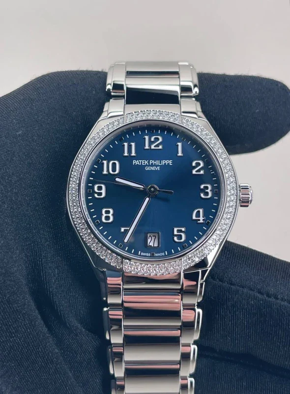 Preowned-7300/1200A-001 Patek Philippe Twenty‑4 Stainless Steel&Diamonds Lady's Watch (Like NEW) - is a stunning luxury watch for women, combining elegance with modern sophistication. Its 36 mm stainless steel case is complemented by a fixed bezel set, radiating refined brilliance. The blue sunburst dial features silver-tone hands and Arabic numeral hour markers for a clean, contemporary look, while a date display at 6 o’clock adds practical functionality.
