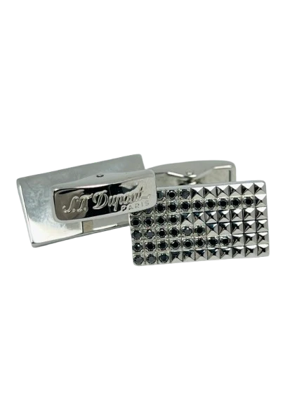 005415 S.T.Dupont. These rectangular Cufflinks come in Stainless Steel and are decorated with 72 Black Diamonds (1.08Ctw). Whale Back Closure, symmetric shape. 005415 S.T.Dupont Steel Cufflinks.