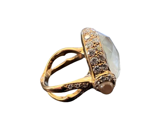 Webster_3938 Stephen Webster  This is a stunning Stephen Webster design. The ring comprises 18k Yellow Gold with diamond accents and a center stone of faceted quartz with a mother-of-pearl base. A captivating cocktail ring. Size 6.5.