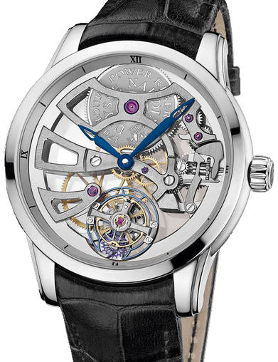 Preowned - 1700-129 Ulysse Nardin This Men’s watch has a 44 mm 18K white gold case. Fixed 18K white gold bezel. Silver skeleton dial with black Roman numerals and hour markers.Blue hour hands with pointed tips of a special curved shape. Tourbillon located at the 6 o'clock position. Mechanical watch with manual winding is powered by a Сalibre UN-170. Power reserve approximately 170 hours.Case back is skeleton. Sapphire crystal protects front and back side of the watch.The watch performs following functions: hours, minutes, tourbillon. Black alligator leather strap with folding clasp.This model is water-resistant up to 30 m.